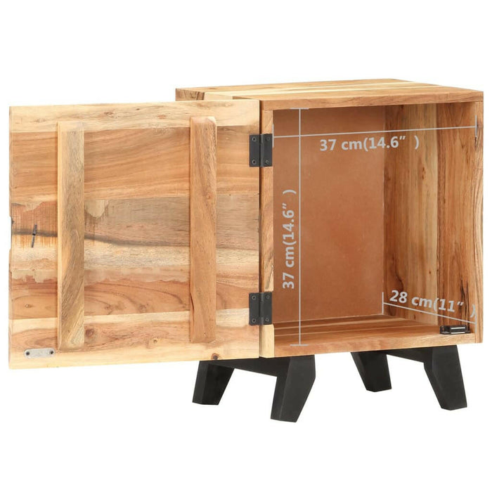 Dit zorgvuldig vervaardigde nachtkastje uit massief acaciahout biedt een perfecte combinatie van duurzaamheid en esthetiek. Met een breedte van 40 cm, diepte van 30 cm en hoogte van 51 cm, is het de ideale maat om naast uw bed te plaatsen en zo een georganiseerde ruimte te creëren. Het kastje is uitgerust met een deur wat bijdraagt aan de opbergruimte, terwijl het decoratieve blad perfect is voor het tentoonstellen van uw favoriete decorstukken zoals boeken, vazen, of een nachtlampje. De sterke constructie, ondersteund door elegante zwarte poten, maakt het tot een betrouwbare keuze voor dagelijks gebruik.