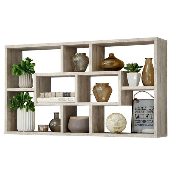 Met zijn royale afmetingen van 85 x 15,6 x 47,4 cm (B x D x H) biedt het schap meer dan voldoende ruimte voor een scala aan items. Elke van de acht ruime vakken heeft een unieke vorm en grootte, waardoor het een dynamisch effect creëert dat perfect aansluit bij jouw persoonlijke stijl, of het nu gaat om de woonkamer, slaapkamer of zelfs een kantooromgeving. De eenvoudige montage zorgt ervoor dat je snel kunt genieten van alle voordelen die dit prachtige wandschap te bieden heeft.