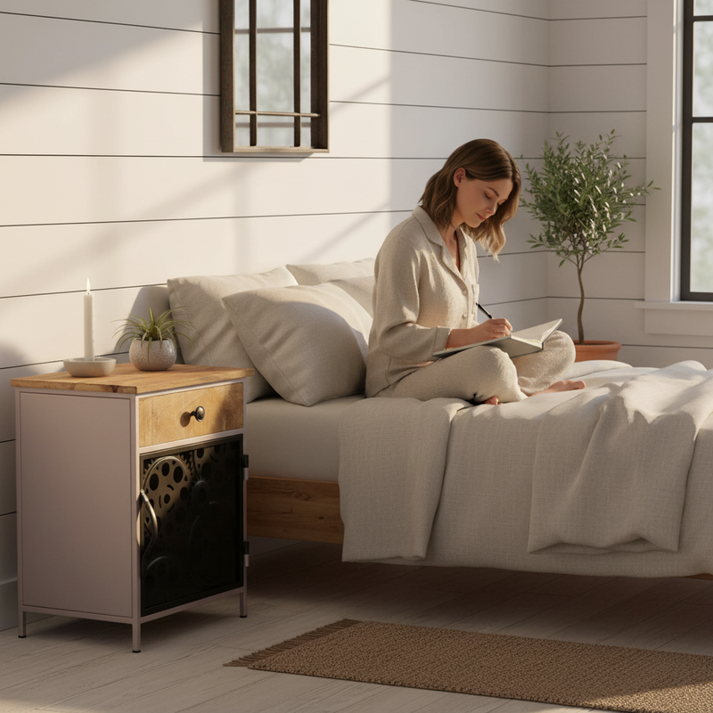 Der Nachttisch besteht aus rauem Mangoholz, einem tropischen Hartholz, das viel Gewicht tragen kann . Außerdem ist es verschleißfest und macht den Schrank stabil und langlebig. Die Handwerkskunst und die schöne Holzmaserung machen jedes Möbelstück einzigartig und unterscheiden sich leicht vom anderen. Dieser Schlafzimmerschrank verfügt über 1 Tür und 1 Schublade und bietet viel Platz, um Ihre Sachen organisiert und griffbereit aufzubewahren. Die Tür besteht aus echten Kettenblättern, was sie stilvoll und einzigartig macht.