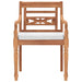 Bei der Lieferung erhalten Sie zwei Stühle, jeweils komplett mit einem bequemen Sitzkissen. Der Zusammenbau der Stühle ist ein Kinderspiel, sodass Sie schnell Freude an Ihrem Neukauf haben können. Die mit Teaköl behandelte Oberfläche betont die natürliche Schönheit des Holzes und macht diese Stühle zu einer warmen Ergänzung Ihrer Außenumgebung.