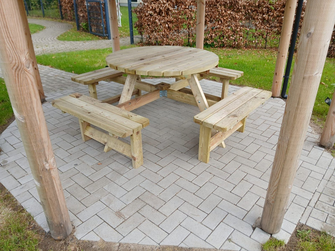 Runder Picknicktisch mit Platz für 8 Erwachsene (oder Kinder). Dieser runde Picknicktisch (Durchmesser 120 cm) passt perfekt auf jeden Spielplatz oder Ihre Gartenterrasse. Mit seinen vier separaten Bänken bietet dieses KING-Produkt Platz für acht Personen und ist ideal zum Essen mit Freunden oder zum Spielen eines Brettspiels. Dank der dicken Tischplatte (40 mm), dem Sonnenschirmloch (Durchmesser 4 cm) und den abgerundeten Ecken können Sie sich auf ein gut verarbeitetes und sehr sicheres Sitzmöbel für Jung und Alt verlassen.