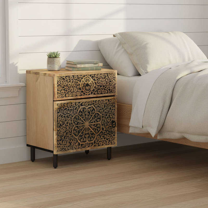 Der Nachttisch Qunar | Zomango ist aus massivem Mangoholz gefertigt, was seinen robusten und langlebigen Charakter unterstreicht. Die schöne Maserung des Holzes sorgt dafür, dass jeder Schrank in seiner Art einzigartig ist. Die Kombination aus reichhaltigen Retro-Elementen wie handgeschnitzten Blumenmustern und industriellen Details wie robusten Eisenbeinen verleiht diesem Möbelstück eine besondere Persönlichkeit. Mit einer geräumigen Schublade und einem durch eine Tür geschützten Fach bietet dieser Schrank mehr als genug Stauraum für alle wichtigen Utensilien. Die stabile Platte eignet sich ideal zum Präsentieren Ihrer Lieblingsdekorationsgegenstände und schafft eine einzigartige Atmosphäre in Ihrem Schlafzimmer.
