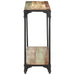 Die aus wiederverwertetem Holz alter Gebäude gefertigten Tische strahlen eine einzigartige Kombination aus Stil und Charakter aus. Diese handgefertigte Kreation garantiert, dass keine zwei Exemplare identisch sind. Durch die Verwendung unterschiedlicher Holzarten ist das Möbelstück nicht nur langlebig, sondern auch reich an Texturen und Nuancen. Die robuste Konstruktion mit schwarz pulverbeschichtetem Stahlrahmen sorgt für Stabilität und Standfestigkeit. Die geräumige Tischplatte bietet Platz für dekorative Elemente, während die untere Ablage ideal für Zeitschriften und Bücher ist und so für Ordnung und Ordnung in Ihrem Wohnraum sorgt.