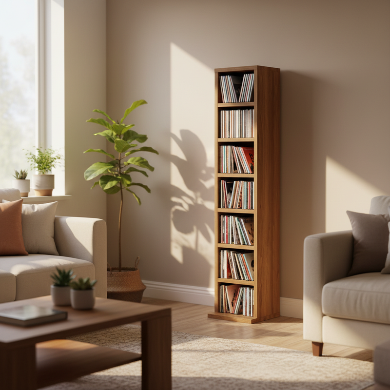 With dimensions of 21 x 20 x 88 cm (W x D x H), this space-saving CD cabinet offers ample storage space thanks to its six open compartments. The processed wood ensures a smooth surface that is not only durable but also moisture-resistant, enhancing the product's lifespan. Additionally, it can serve as an archive cabinet in an office or study, or as extra storage in the bedroom.