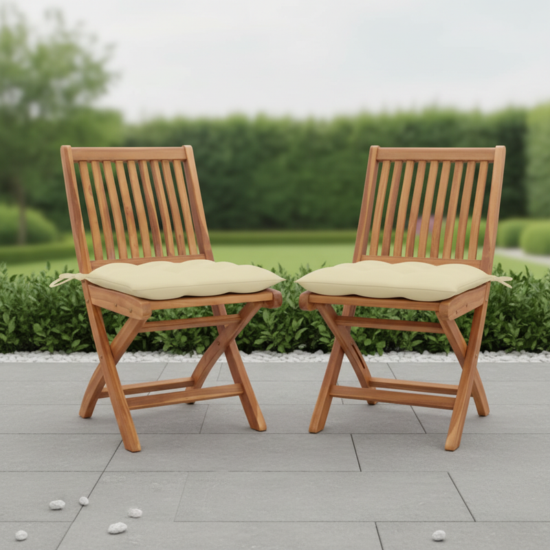 This set of high-quality garden chairs is made from sustainably sourced hardwood teak that has been carefully treated. The wood is water-treated, oven-dried, and meticulously sanded, resulting in a beautifully finished product that is weather-resistant and easy to clean. Teak excels in strength and weather resistance, making it the ideal choice for garden furniture. The chairs are designed to be foldable, which is convenient for storage when not in use. Additionally, they come with comfortable cushions that can be easily attached to the chairs with two sets of ties, ensuring you have an optimal seating experience.