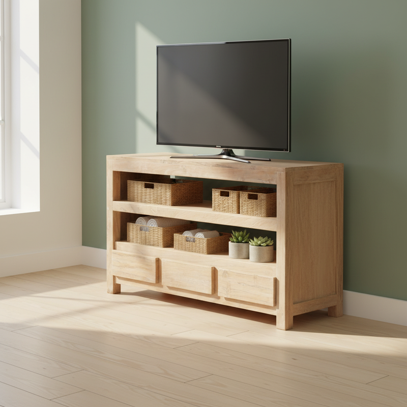 This wooden piece of furniture is crafted from high-quality acacia wood, a robust and durable tropical hardwood suitable for years of use. Each piece is carefully made, with every process from polishing to lacquering highlighting the unique wood grains. This means that no two pieces of furniture have the same appearance. Thanks to the smooth surface, you can easily place ornaments or small accessories, making it not only functional but also a decorative addition to your living room. With dimensions of 90 x 30 x 55 cm (W x D x H), the cabinet offers ample storage space with two shelves and three drawers, perfect for organizing magazines, books, and multimedia devices. The furniture comes fully assembled, further enhancing ease of use.