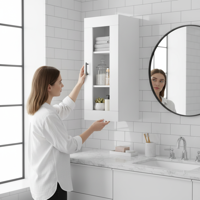 This wall-mounted cabinet is made from high-quality processed wood, known for its durability and stability. This material not only has a smooth surface but is also moisture-resistant, making it perfect for various (living) environments. The cabinet is ideal for storing daily essentials, keeping everything organized and within reach. Thanks to the smart wall-mount design, you save floor space while still creating ample storage. The glass door ensures that your items are visible while being protected from dust. With the user-friendly handle, the cabinet is easy to open.