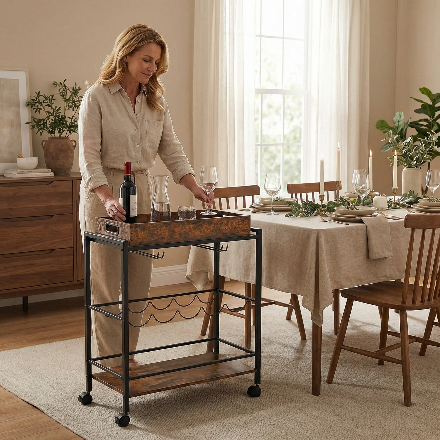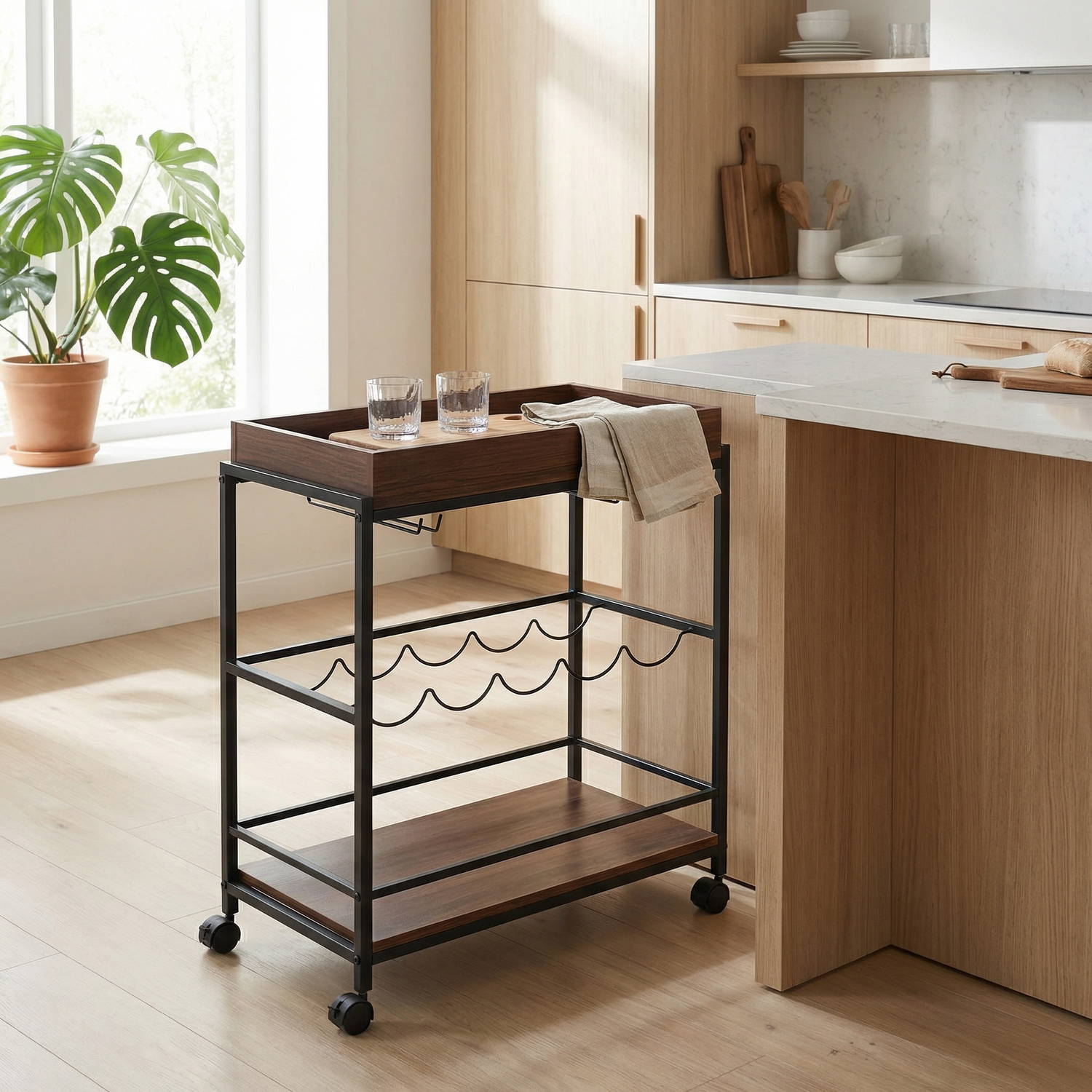 Compact in size, this trolley still offers surprising everyday convenience. The top tray is ideal for placing glasses or bottles, while the integrated bottle rack provides extra storage space. Thanks to the wheels, you can easily move the cart wherever you need it.