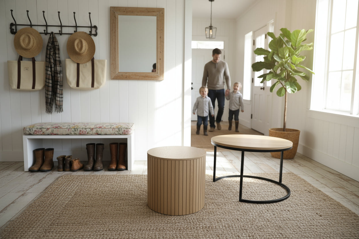 This round nesting coffee table set includes two tables that can be used together or separately. Thanks to the clever design, the smaller table slides neatly underneath the larger one to save space — or can be placed individually as a side table.