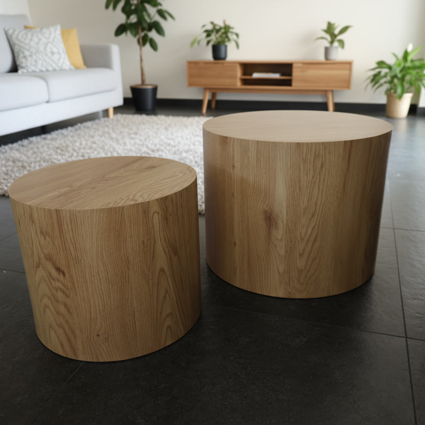 Discover the round wooden coffee table set of 2, a perfect blend of natural charm and practical design. Each table features a sturdy cylindrical base and a smooth round tabletop — ideal for drinks, books, or decorative items.