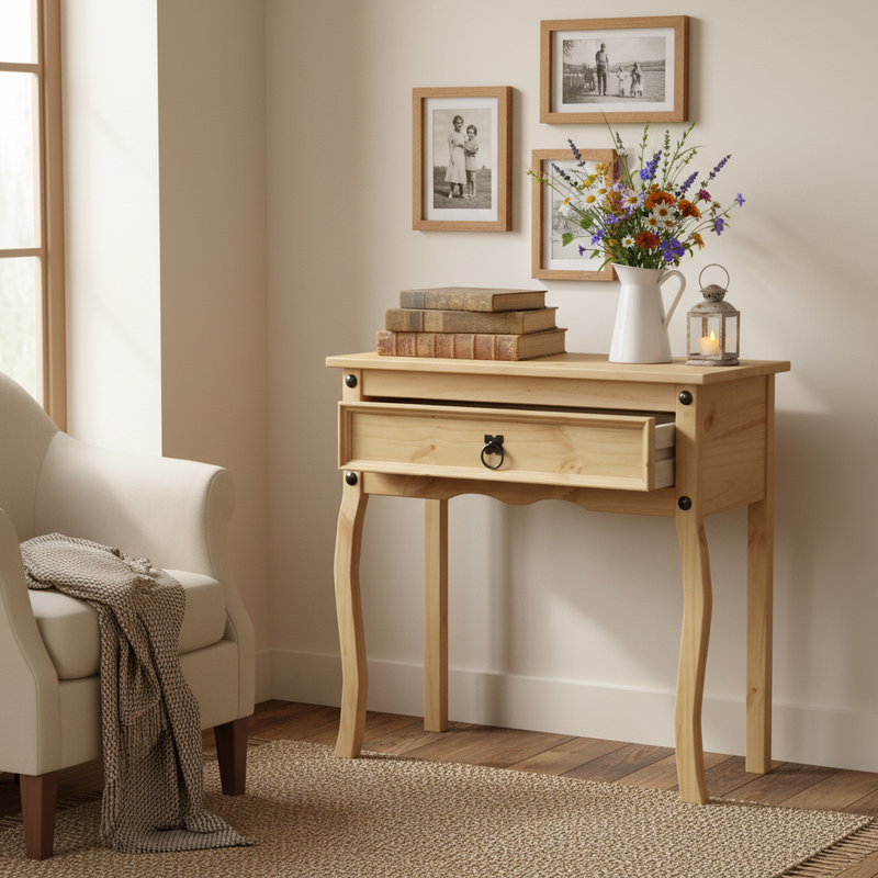 With the Ralvionis | Grenova wall table, you bring home a practical piece of furniture that not only offers storage space but also adds a stylish accent to your interior. The sturdy construction of solid pine wood guarantees long-lasting use, while the drawer helps you maintain an organized space. The combination of functionality and aesthetics makes this furniture piece a must-have.