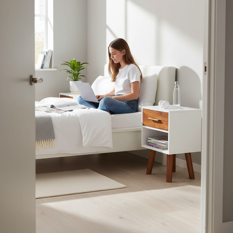 La Mesita de Noche Glimmer | AcaciaNova | Blanca es una adición perfecta a cualquier interior, donde la versatilidad y el estilo se combinan en una hermosa pieza de mobiliario. Esta mesita de noche está fabricada con madera de acacia maciza, combinada con MDF de alta calidad, lo que garantiza una construcción sólida y duradera. Ya sea que la uses como mesita de noche, mesa auxiliar o mesa de acento, esta pieza ofrece tanto funcionalidad como un encantador estilo retro.