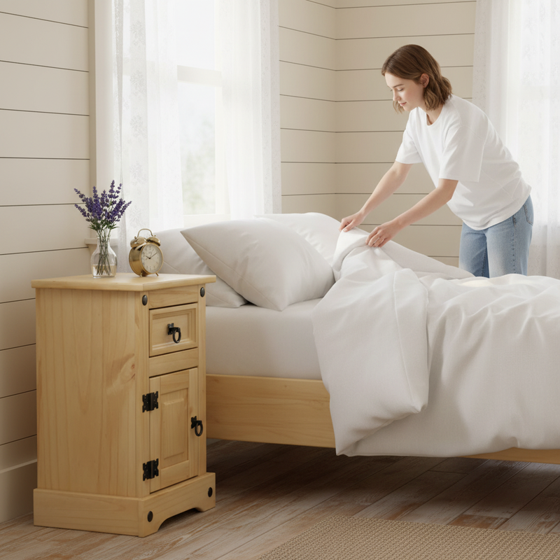 Con la Mesita de Noche Zylor no solo adquieres un mueble; inviertes en calidad y durabilidad. Fabricada en madera de pino de alta calidad, esta mesita irradia un encanto rústico con sus nudos característicos y vetas rectas. Equipado con un práctico cajón y un amplio compartimento, crea el lugar perfecto para almacenar libros, revistas y otros artículos necesarios. Los tiradores de metal aportan un acabado elegante y aseguran un uso sin esfuerzo.