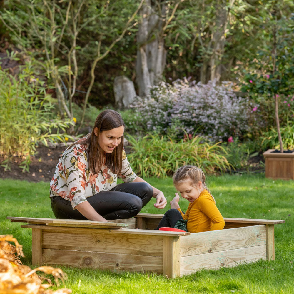 Avec ses dimensions compactes et son design intelligent, ce bac à sable offre suffisamment d'espace pour que les enfants puissent construire ensemble des châteaux de sable, creuser des trésors et laisser libre cours à leur imagination. Grâce au bois de pin robuste certifié FSC, vous contribuez également à une gestion responsable des forêts.