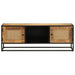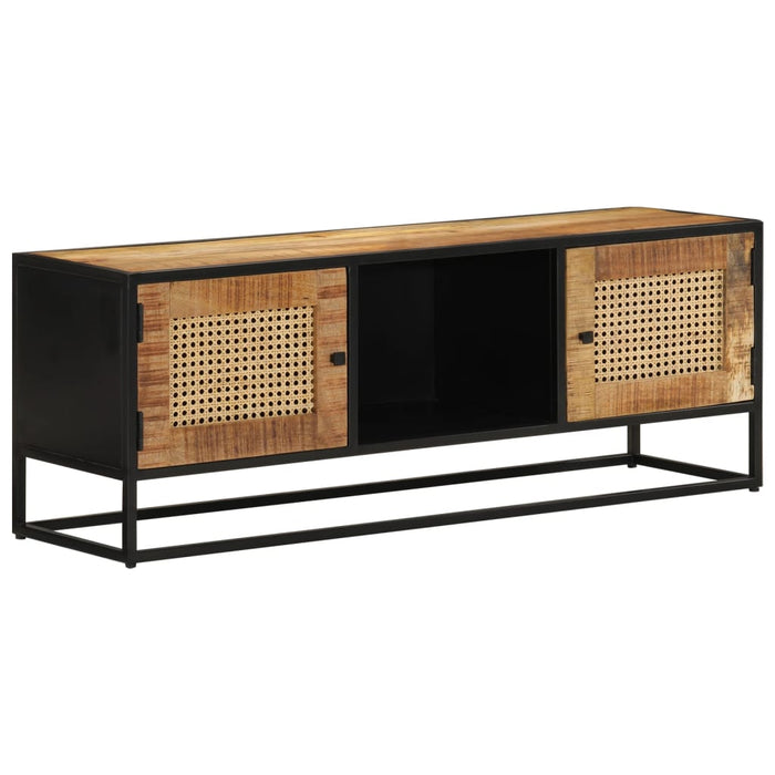 Ce meuble TV rétro en bois est un ajout accrocheur et pratique à votre intérieur. Il est fabriqué en bois de manguier massif, ce qui garantit que chaque meuble est unique dans son apparence. Le meuble TV est équipé de trois étagères spacieuses, idéales pour ranger de manière ordonnée et ordonnée tous vos lecteurs DVD, consoles de jeux, appareils de streaming et supports multimédias. Le dessus robuste offre un endroit parfait pour les livres, les décorations ou autres objets personnels. Les pieds en fer stables contribuent à la solidité et à la stabilité globales du meuble. De plus, vous pouvez ranger vos affaires à l'abri de la poussière derrière les portes pratiques de ce meuble multimédia.