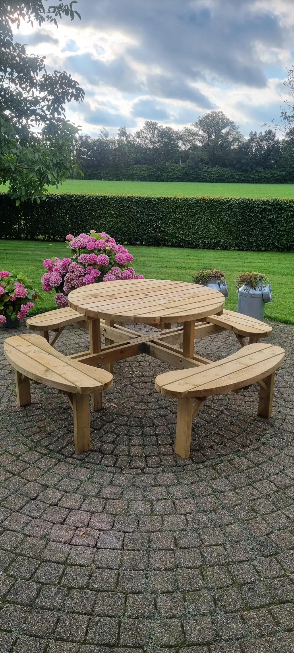 Bedankt voor je enthousiaste review! Wat leuk dat je zo tevreden bent met de tafel, en inderdaad, de ronde picknicktafels zijn echt een van de mooiste keuzes. Fijn dat het ontwerp goed bevalt en voor een gezellige zit zorgt. Veel plezier ermee!