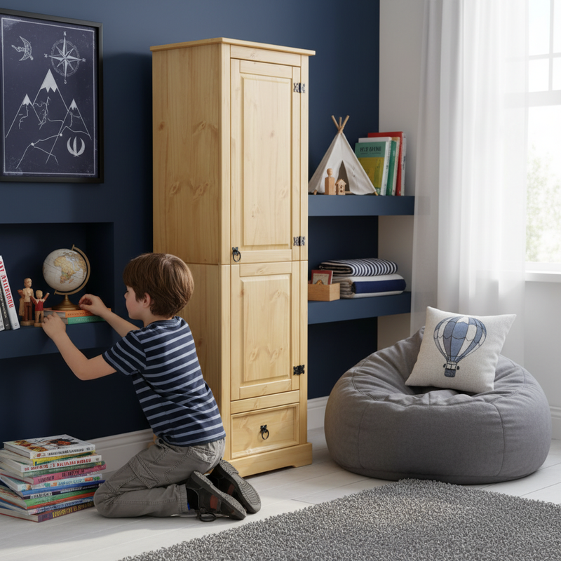 Avec la garde-robe Kovara | Avec Luxeline, vous obtenez non seulement un meuble, mais aussi une merveille de rangement fiable en bois de pin massif robuste. Avec ses grains droits et ses nœuds pleins de caractère, ce meuble s'intègre parfaitement dans n'importe quel intérieur. Les compartiments spacieux sont idéaux pour ranger des vêtements plus longs et des travaux soigneusement pliés. Les poignées métalliques élégantes rendent non seulement l'armoire pratique, mais lui donnent également une apparence finie et élégante.