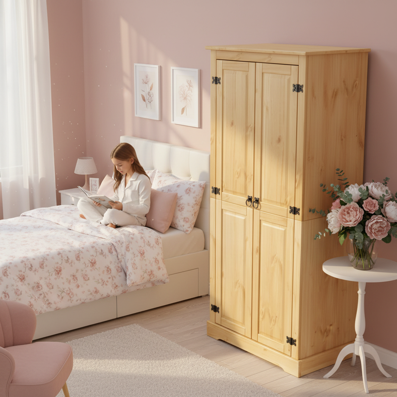 L'armoire Marnox | Luxeline est fabriqué à partir de bois de pin massif de haute qualité, connu pour son grain caractéristique et son aspect rustique. Cela garantit non seulement une esthétique authentique, mais également une structure durable et robuste qui durera des années. Grâce à son design astucieux, l'armoire offre suffisamment d'espace de rangement pour tous vos vêtements, des robes longues aux pulls pliés, et même pour les accessoires tels que les chapeaux et les sacs à main. Les élégantes poignées en métal offrent une finition raffinée et facilitent l'ouverture et la fermeture des portes de l'armoire.