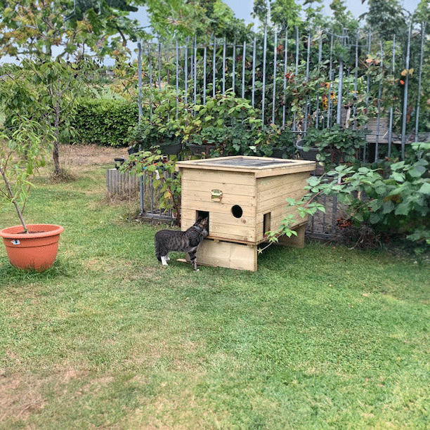 Un client privé possède un chat domestique, mais s'occupe également d'un chat errant timide. L'abri se trouvait uniquement dans son jardin et la nuit, il pouvait déjà prendre des images de la façon dont le chat errant avait découvert sa nouvelle maison. Magnifique, n'est-ce pas ?