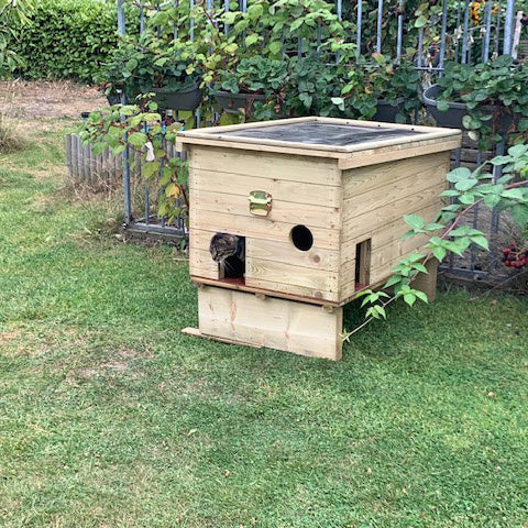 Il s'agit d'un refuge de luxe pour chat(s) (errant). Cette cage isolée pour chat possède 2 compartiments et peut accueillir 3 à 4 chats. Un espace pour se détendre et un véritable coin nuit entièrement isolé. La zone d'accès dispose de 2 entrées/sorties, offrant ainsi une issue de secours. Cette pièce dispose également d'un judas pour votre chaton. Les pièces intérieures sont finies en bois stratifié, qui ne laisse pas passer l'eau. Vous pouvez donc nettoyer ces pièces très facilement de l’intérieur. Le toit peut bien entendu être ouvert et même la paroi intérieure peut être temporairement retirée. Le toit est également fini en EPDM et lorsqu'il pleut, l'eau s'écoule du toit en pente. Il y a des fentes sur la tablette inférieure du toit pour que l'eau puisse s'écouler (pas encore visible sur ces photos).