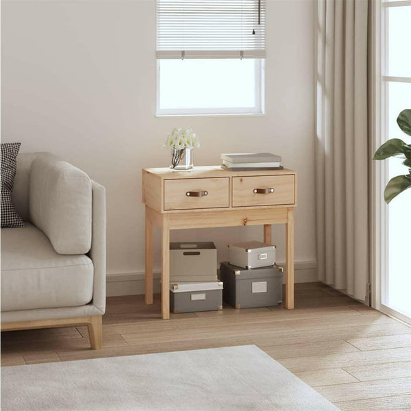 Questo elegante tavolo da parete è realizzato in legno massello di pino, un materiale naturale e splendido che garantisce durata e robustezza. Le caratteristiche venature dritte e i nodi conferiscono al tavolo un aspetto rustico che si adatta a qualsiasi arredamento. Con dimensioni di 76,5 x 40 x 75 cm (L x P x A), questo tavolo è progettato per offrire ampio spazio di archiviazione con due pratici cassetti. In questo modo, puoi tenere tutti i tuoi oggetti quotidiani ben organizzati e a portata di mano.