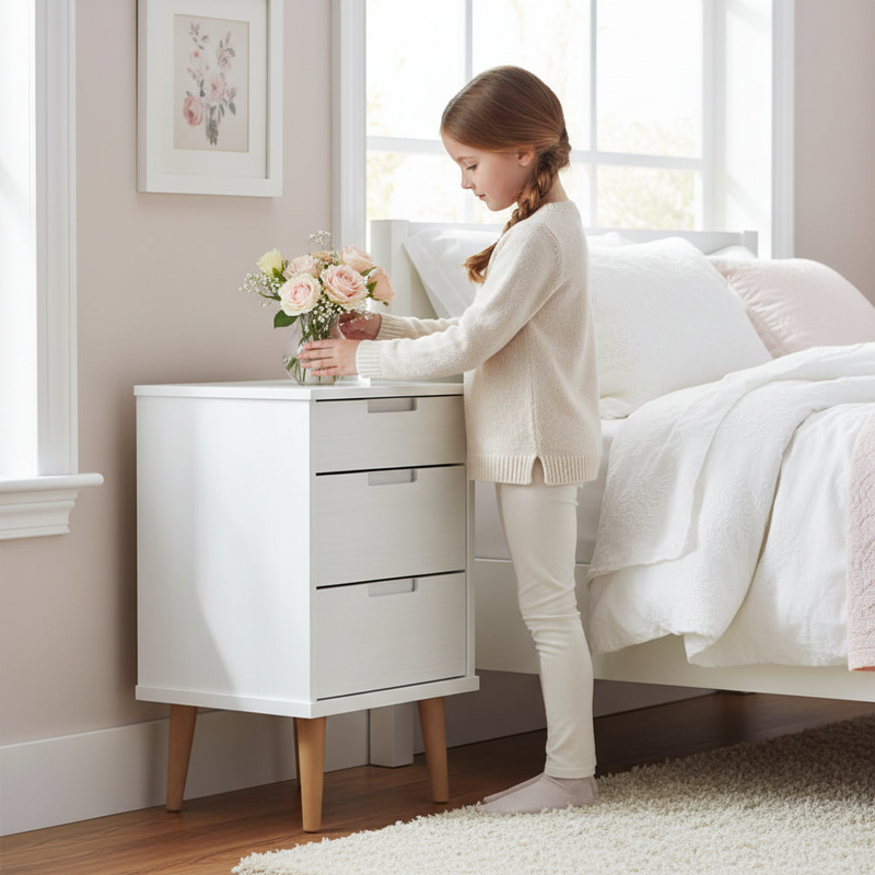 Il Comodino Xenvo | Grenova emana un fascino naturale, grazie all'uso di legno di pino massello noto per le sue venature diritte e l'aspetto rustico. I tre ampi cassetti offrono ampio spazio di archiviazione per tutte le tue necessità, e il robusto piano è ideale per oggetti decorativi come cornici per foto e piante in vaso. Questo elegante comodino, rifinito con una laccatura bianca elegante grazie a un trattamento con vernice uv, garantisce non solo un aspetto lussuoso, ma anche una durabilità tangibile. Grazie al telaio stabile, puoi godere della necessaria solidità.