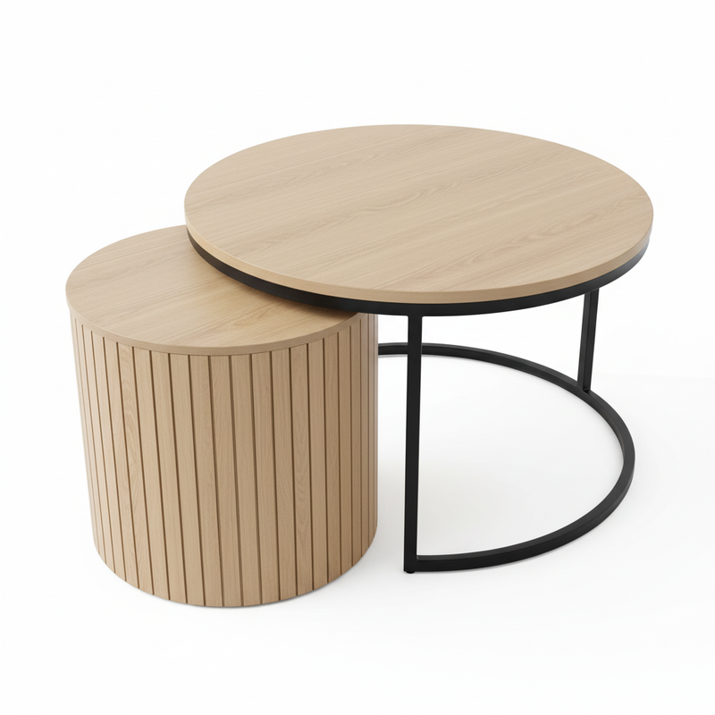 Questo set di tavolini rotondi nesting è composto da due tavolini che possono essere utilizzati insieme o separatamente. Grazie al design intelligente, il tavolino più piccolo può scorrere facilmente sotto quello grande per risparmiare spazio — oppure essere posizionato altrove come tavolino laterale aggiuntivo.