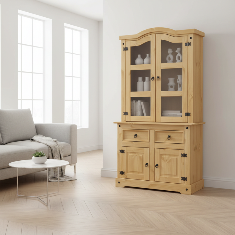 De Hoge Kast Cana Palmera | Grenova is vervaardigd uit massief grenenhout, een materiaal dat bekend staat om zijn duurzaamheid en sterke karakter. Dankzij de glazen deuren kun je met trots je verzameling kopjes, borden en decoratieve voorwerpen tentoonstellen, terwijl de gemakkelijk te openen metalen handgrepen in ringvorm ervoor zorgen dat je altijd moeiteloos toegang hebt tot je spullen. Deze kast is niet alleen een decoratief meubel, maar ook een praktische oplossing om je ruimte georganiseerd en vrij van rommel te houden. Bovendien is de kast onderhoudsvriendelijk, wat betekent dat je meer tijd kunt besteden aan genieten in plaats van schoonmaken. Het enige wat je nodig hebt, is een vochtige doek om hem in topconditie te houden.