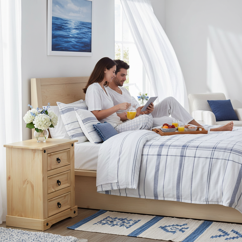 Het nachtkastje biedt praktische opbergruimte met zijn drie ruime lades, waardoor je persoonlijke spullen altijd binnen handbereik zijn. De sierlijke metalen handgrepen zorgen voor een moeiteloze bediening en voegen een vleugje verfijning toe. Dankzij het stevige ontwerp en de hoogwaardige materialen blijft het nachtkastje door de jaren heen zijn uitstraling behouden. Bovendien is het ontwerp onderhoudsvriendelijk, dankzij de honingbruine wasafwerking die bescherming biedt tegen de dagelijkse slijtage.