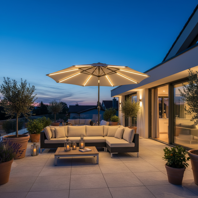 Het solar paneel in de top van de parasol vangt zonlicht op en laadt de geïntegreerde LED-verlichting op, zodat u 's avonds zonder kabels kunt genieten van sfeervolle verlichting.