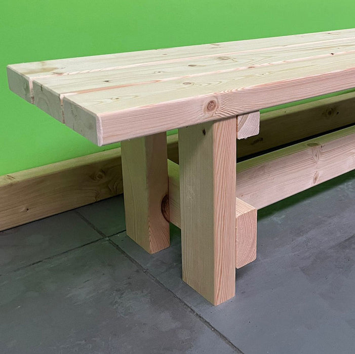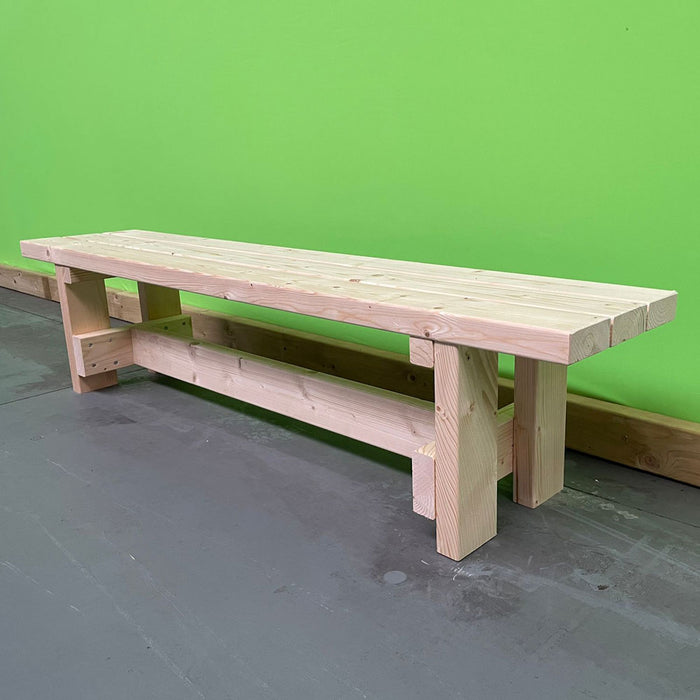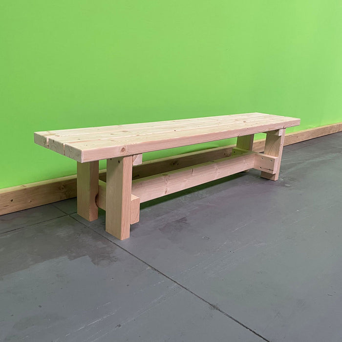 Absoluut! Het stevige hout en het lage ontwerp maken deze bank ideaal voor kleuters. Zorg er wel voor dat je het hout beschermt tegen vocht door het te behandelen.