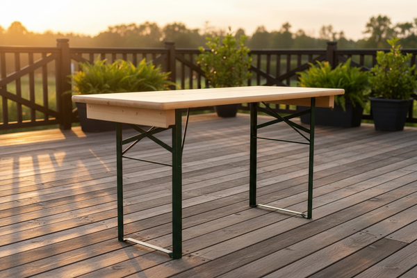 Ervaar de veelzijdigheid van onze compacte KING® opklapbare tafel van 110 cm, een budgetvriendelijke en ideale keuze voor buffet- of eettafels op communie-, tuin- en schoolfeesten. Deze tafel biedt uw gasten een handige plek voor hun drankjes terwijl ze genieten van een goed gesprek, of u kunt er smakelijke hapjes op serveren tijdens een zonnige aperitief. Het gelakte hout (dikte 2,8 cm, witgeel tot lichtbruin) maakt het eenvoudig om vlekken achteraf te verwijderen. Veiligheid en gebruiksvriendelijkheid staan centraal, met afgeronde hoeken en eenvoudig opklapbare poten.