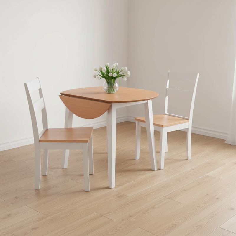 De eetkamerset bestaat uit een tafel met inklapbare zijkanten en vier ergonomisch ontworpen stoelen die perfect onder de tafel schuiven wanneer ze niet in gebruik zijn. Dit maakt het eenvoudig om de ruimte aan te passen aan jouw behoeften. Dankzij het gebruik van MDF voor het tafelblad is het oppervlak eenvoudig schoon te maken en onderhouden. De poten zijn vervaardigd uit massief rubberwood, wat zorgt voor een uitstekende stabiliteit en duurzaamheid. Het ontwerp is met oog voor detail gepolijst en gelakt, zodat je een tijdloos meubelstuk in huis haalt dat zowel praktisch als stijlvol is. Montage is een fluitje van een cent, zodat je snel van je nieuwe aanwinst kunt genieten.