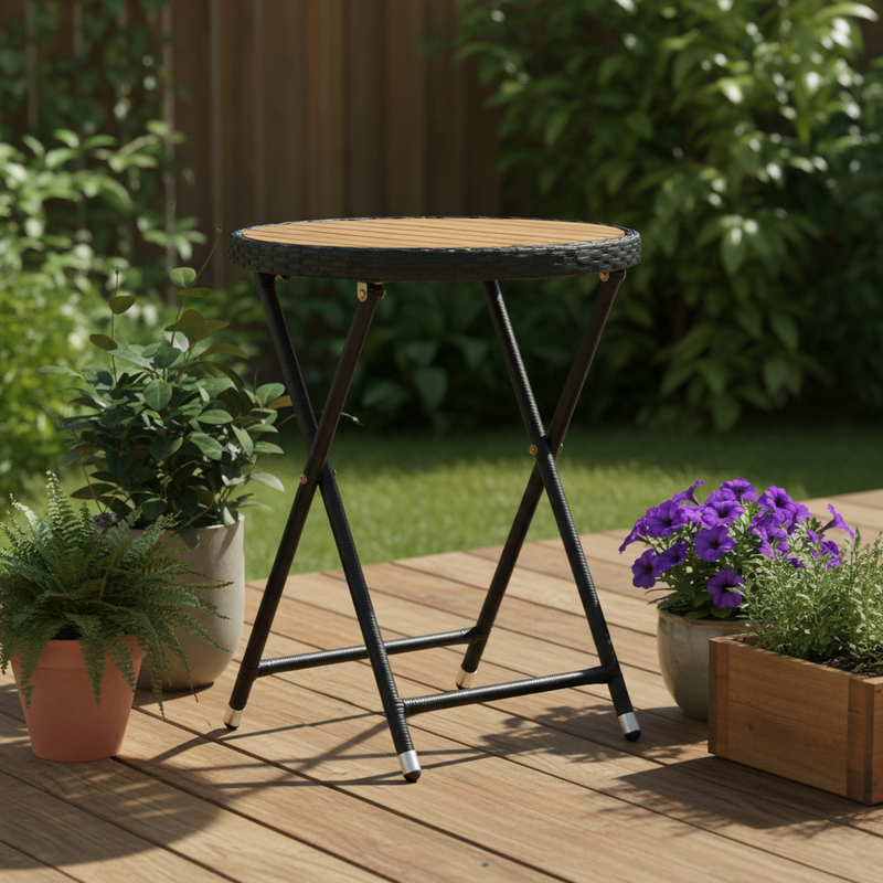 Onze veelzijdige Elvryn tafel is vervaardigd uit hoogwaardig massief acaciahout, dat bekend staat om zijn duurzaamheid en sterke ondersteuning. Met afmetingen van 60 x 75 cm (ø x H) biedt hij genoeg ruimte voor al jouw benodigdheden, terwijl het inklapbare ontwerp zorgt voor eenvoudig transport en opslag. Of je nu een klein terras of een ruime tuin hebt, deze tuintafel kan gemakkelijk worden opgeborgen wanneer hij niet in gebruik is. Het tafelblad is daarnaast eenvoudig te onderhouden, waardoor je meer tijd hebt om te genieten van je buitenomgeving. Het gepoedercoat stalen frame, bedekt met weerbestendig PE-rattan, geeft de tafel niet alleen een moderne uitstraling maar waarborgt ook dat hij jarenlang meegaat, ongeacht de weersomstandigheden. Voor extra bescherming is het aan te raden om de tafel met een waterbestendige hoes af te dekken wanneer deze niet gebruikt wordt.
