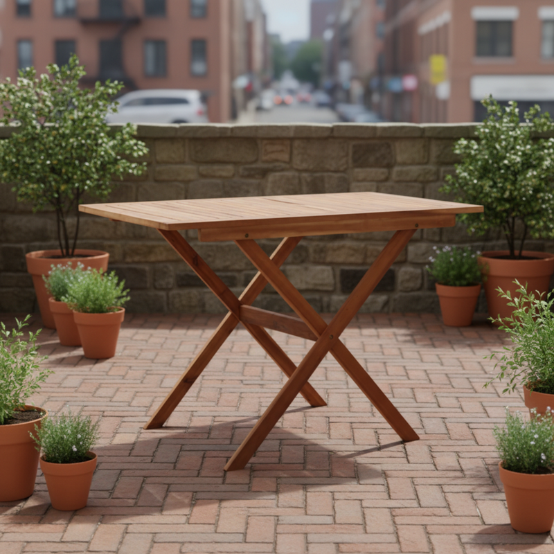 Met een afmeting van 110 x 67 x 74 cm (L x B x H) biedt de tafel voldoende ruimte voor gezellige diners met vrienden en familie. Het kruispootontwerp verleent een robuuste uitstraling en zorgt voor stabiliteit. Gemaakt van massief acaciahout met een natuurlijk olieafwerking, kan deze tafel het hele jaar door buiten blijven staan zonder dat je je zorgen hoeft te maken over de invloed van weersomstandigheden.