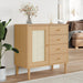 De speelse combinatie van materialen geeft dit dressoir zijn unieke karakter. Het front van de deur is met zorg vervaardigd van poly rattan, wat een gezellige en trendy sfeer toevoegt. Dankzij de hoogwaardige afwerking met uv-vernis voelt het oppervlak luxe aan en blijft het lang mooi. Niet te vergeten, de houten handvatten zorgen voor een praktische en stijlvolle afwerking van de lades en deuren.