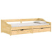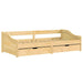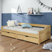 Het bed is vervaardigd uit prachtig massief grenenhout, wat zorgt voor een natuurlijke en rustieke uitstraling. De rechte nerven en kenmerkende noesten geven het bed niet alleen een aantrekkelijk design, maar versterken ook de stevigheid en duurzaamheid. Dit houten kinderbed is ontworpen met optimale luchtcirculatie in gedachten, zodat het matras fris blijft. Dankzij het gelat ontwerp verhoogt het draagvermogen en biedt het extra stabiliteit tijdens het gebruik. Daarnaast transformeer je het kinderbed moeiteloos van een comfortabele speelruimte of bank overdag naar een ruim bed voor de nacht, waardoor het een ideale keuze is voor gezinnen die behoefte hebben aan extra slaapruimte zonder kostbare ruimte in te leveren. Onder het bed bevinden zich twee handige lades, perfect voor het opbergen van kleding, speelgoed, schoenen of beddengoed, zodat de slaapkamer netjes en georganiseerd blijft.