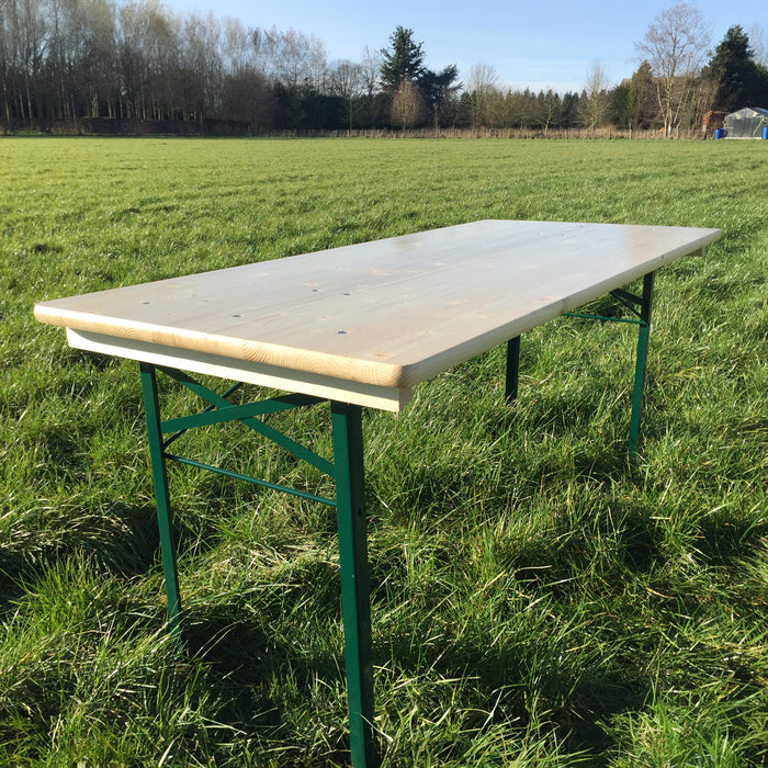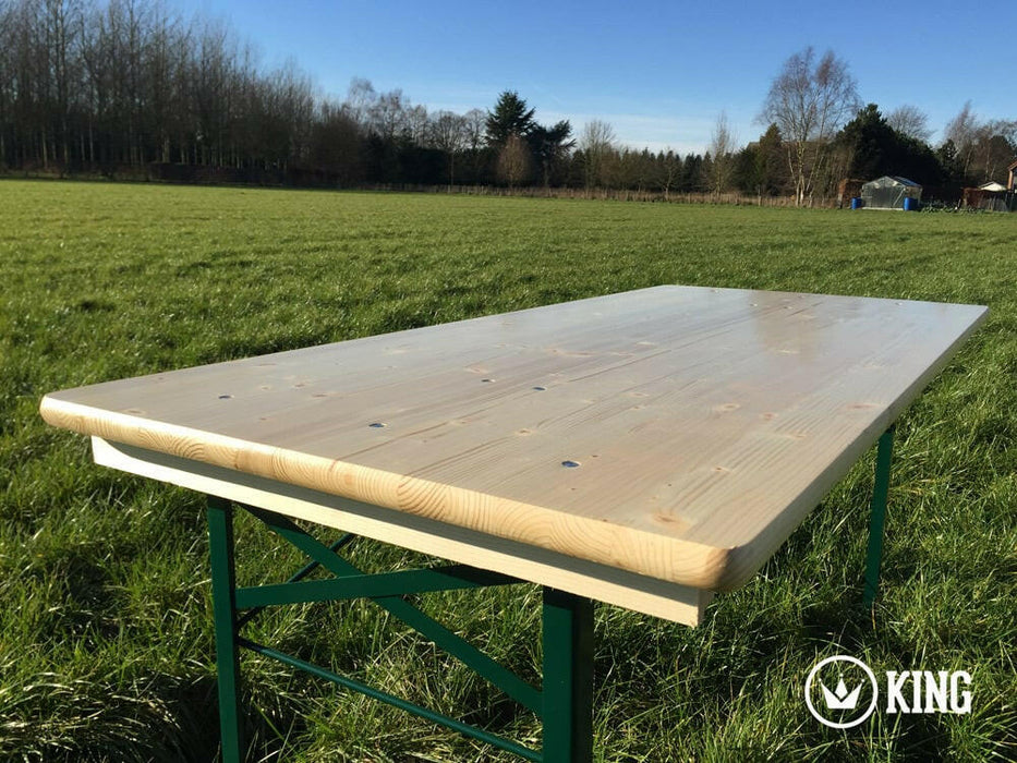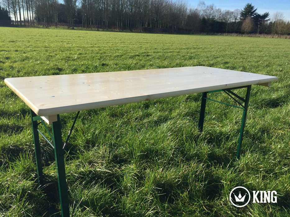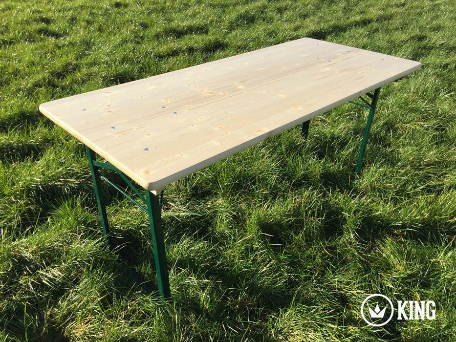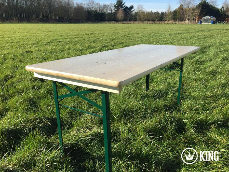 Ontdek de veelzijdigheid van onze handige opklapbare KING® biertafel van 160 x 70 cm, een perfecte aanvulling op elk openluchtevenement. Deze tafel kan dienen als buffet- en eettafel, en dankzij het vooraf dubbel gelakte hout (2,8 cm dik) is hij bestand tegen drank- en voedingsvlekken en alle weersomstandigheden. De witgele tot lichtbruine kleur, afgeronde hoeken en het opklapbare onderstel maken deze KING® tafel een veilige en gebruiksvriendelijke toevoeging aan al uw zomerfeesten.