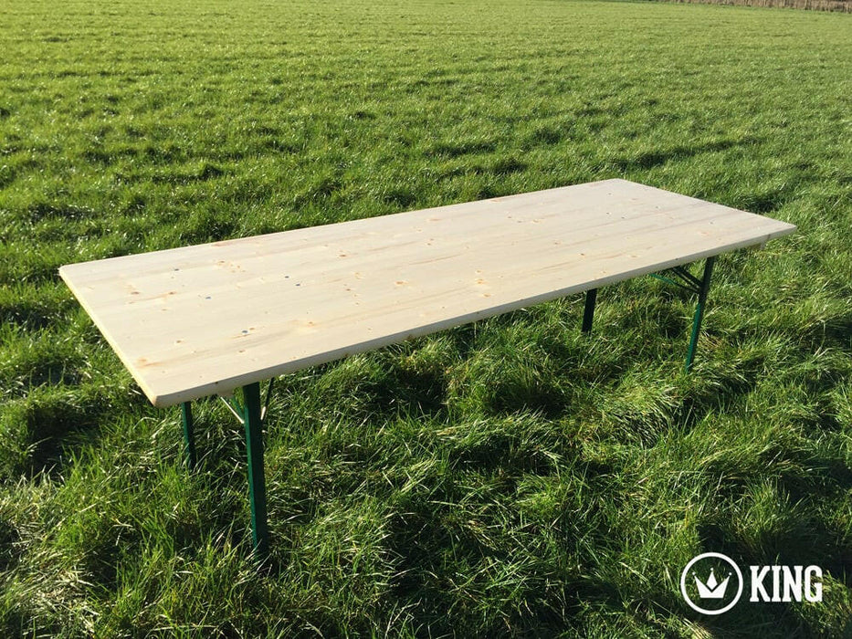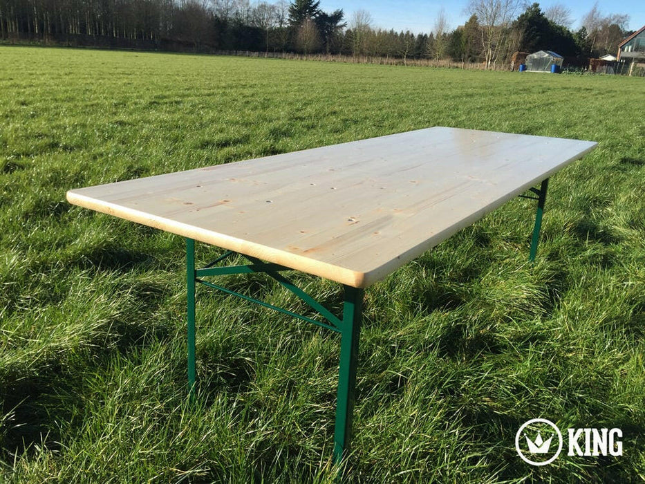 Zoek je een biertafel 220 x 80 die stevig staat, mooi oogt én praktisch is in gebruik? Deze royale KING® biertafel 220 x 80 cm is ideaal als eettafel, buffettafel of feesttafel voor tuinfeesten, opendeurdagen, braderieën en andere openluchtevenementen. Het tafelblad is gemaakt uit dubbel gelakt hout met een plankdikte van 2,8 cm, waardoor het beter bestand is tegen drank- en voedingsvlekken én wisselende weersomstandigheden. De afgeronde hoeken en het opklapbare onderstel zorgen voor extra comfort en veiligheid bij het opstellen en opbergen.