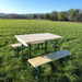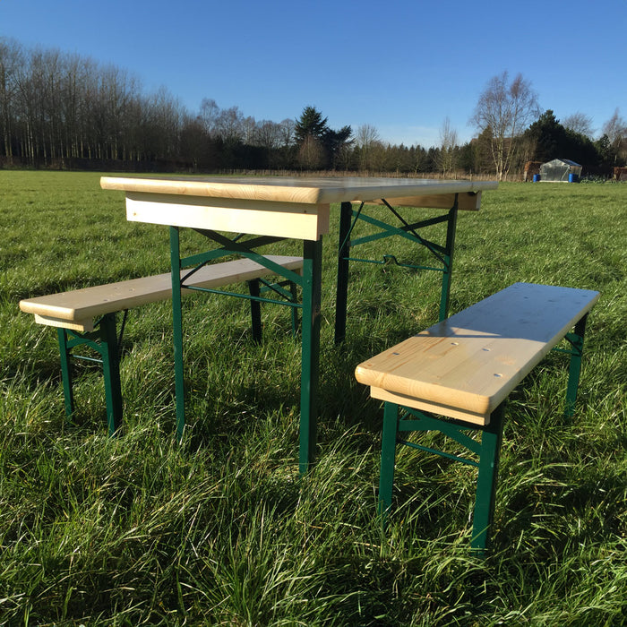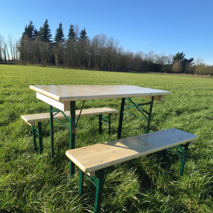 Voeg een gezellige sfeer toe aan elk familiefeest of openluchtevenement met de handige KING® biertafelset (110 cm). De witgele tot lichtbruine KING tafel en twee bijpassende zitbanken bieden plaats aan vier personen voor een ontspannen tafelervaring en drankjes. Het gelakte hout, vooraf behandeld door E-woodproducts, maakt vlekverwijdering eenvoudig. Met een opklapbaar onderstel, afgeronde hoeken en dik hout (3 cm) is deze set een absolute must-have voor zomerse bijeenkomsten!