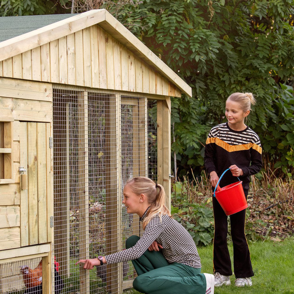 - Duurzaam en Weerbestendig: Het kippenverblijf is gemaakt van hoogwaardig vurenhout, dat geïmpregneerd is voor extra duurzaamheid en bescherming tegen weersinvloeden.
