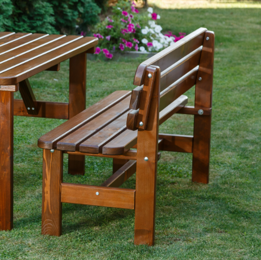 Elegant Ontwerp: Uitgevoerd in een verfijnde donkerbruine lak, geeft deze tuinbank uw buitenruimte een luxueuze en stijlvolle touch.