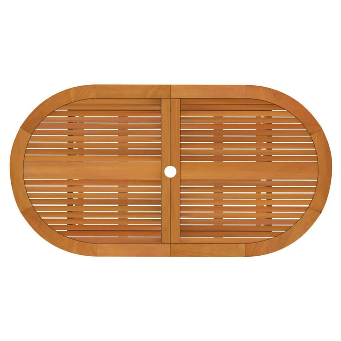De tuintafel is vervaardigd uit massief eucalyptushout, een materiaal dat bekend staat om zijn duurzaamheid en waterafstotende eigenschappen. Met een afmeting van 160 x 85 x 75 cm (B x D x H) biedt het tafelblad voldoende ruimte voor al je drankjes, hapjes en andere benodigdheden. Met het praktische parasolgat kun je eenvoudig een parasol plaatsen om jezelf en je gasten te beschermen tegen de zon of regen, waardoor je volledig kunt genieten van je buitenervaring. Vergeet niet dat het belangrijk is om je tuinmeubelen te beschermen met een waterbestendige hoes om hun levensduur te verlengen.