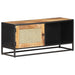 Met afmetingen van 90 x 30 x 40 cm (B x D x H) biedt dit meubel voldoende ruimte voor al uw apparaten en accessoires. Het prachtige vakmanschap en de unieke houtnerven van mangohout zorgen ervoor dat elk stuk uniek is, waardoor uw meubels niet alleen praktisch zijn, maar ook een artistiek statement maken. Het ijzeren frame voegt stevigheid toe en garandeert dat uw meubel jaren meegaat. Het webbing patroon op de deur voegt bovendien een stijlvolle rustiek tintje toe aan het geheel.