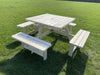 Ontdek de stijlvolle en praktische vierkante picknicktafel, die met zijn frisse uitstraling en natuurlijke charme elke tuin of terras transformeert. Met een licht en modern design is deze tafel ideaal voor intieme diners en gezellige samenkomsten in buitenruimtes van diverse afmetingen.