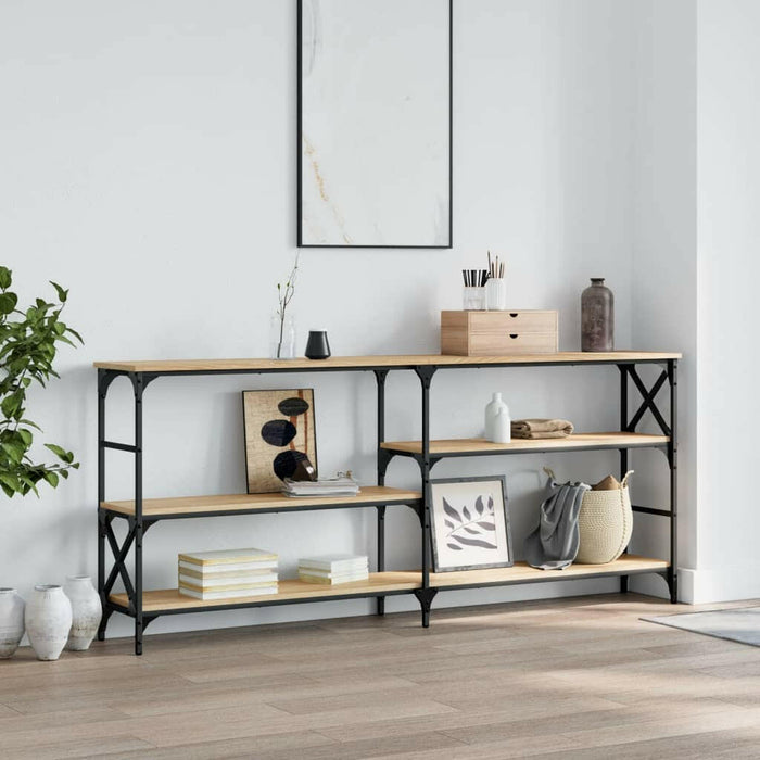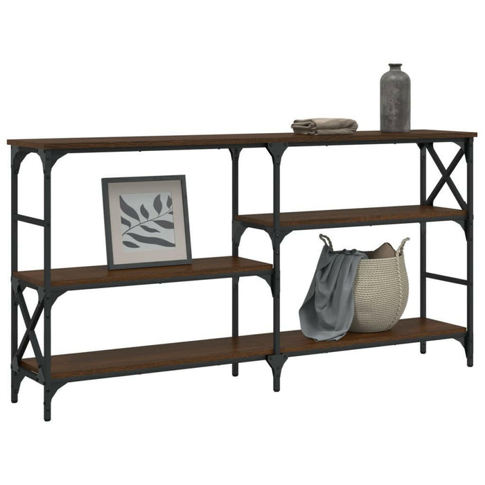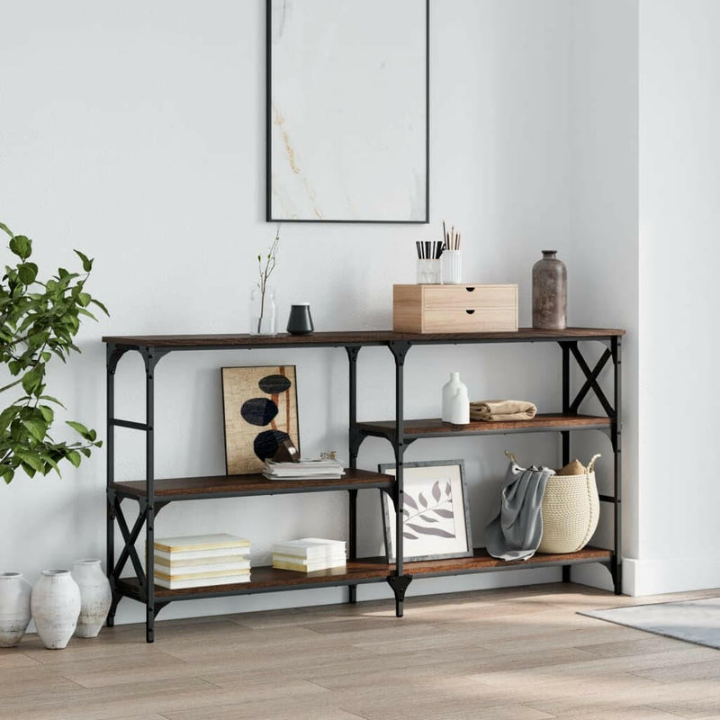 Met afmetingen van 150 x 29 x 76,5 cm (B x D x H) is deze haltafel van bewerkt hout en staal zowel sterk als stabiel. Het hoogwaardige bewerkte hout heeft een glad oppervlak dat niet alleen een luxe uitstraling heeft, maar ook vochtbestendig en duurzaam is. Het stevige stalen frame biedt extra stabiliteit, waardoor je verzekerd bent van een lange levensduur van het product. Daarnaast zorgt de voldoende opbergruimte ervoor dat je accessoires en andere benodigdheden altijd binnen handbereik zijn. Het stevige tafelblad is ideaal voor het plaatsen van fotolijstjes, potplanten en andere decoratieve elementen. Dankzij de zes verstelbare poten met kunststof voetjes blijft de wandtafel stabiel, zelfs op oneffen ondergronden.